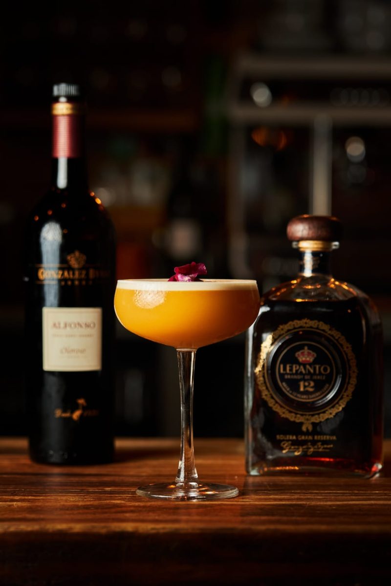 Brandy lepanto, oloroso Alfonso, pure maracuya, sirope de coco, clara de huevo, aromatizado con agua de azahar